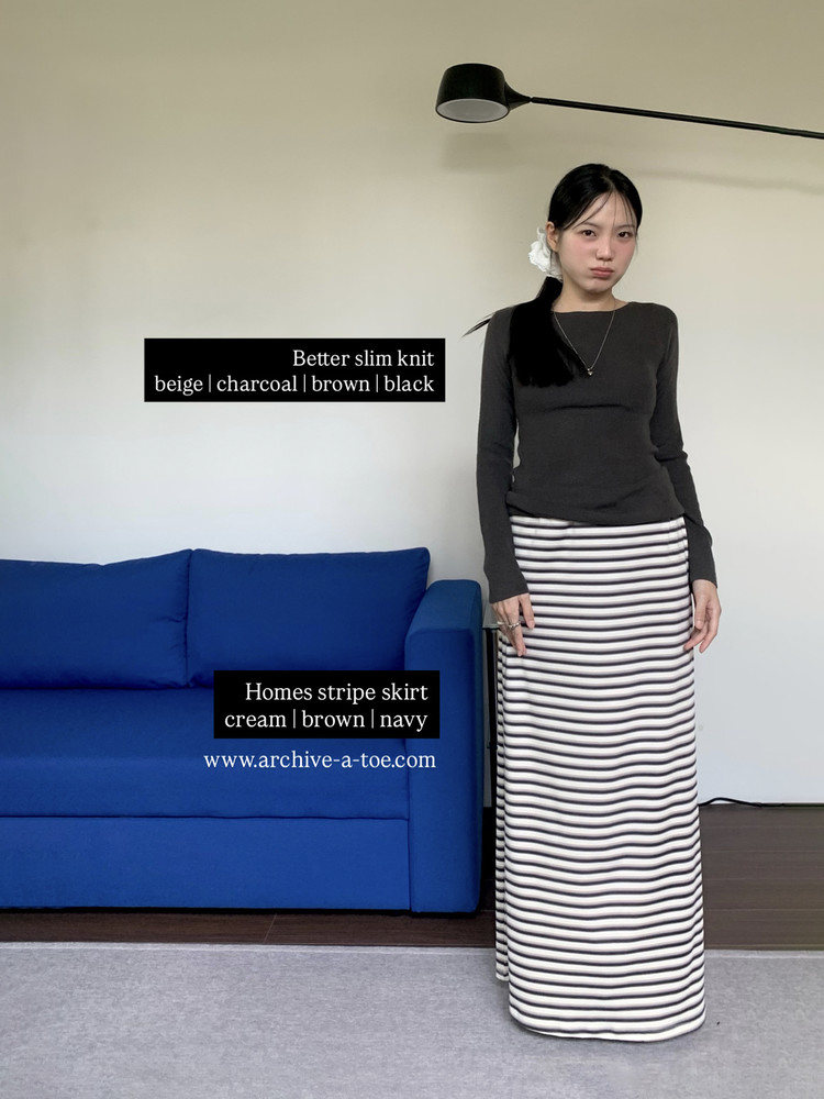모델 촬영컷은 베럴 슬림 니트(차콜) + 홈즈 스트라이프 스커트(크림아이보리)